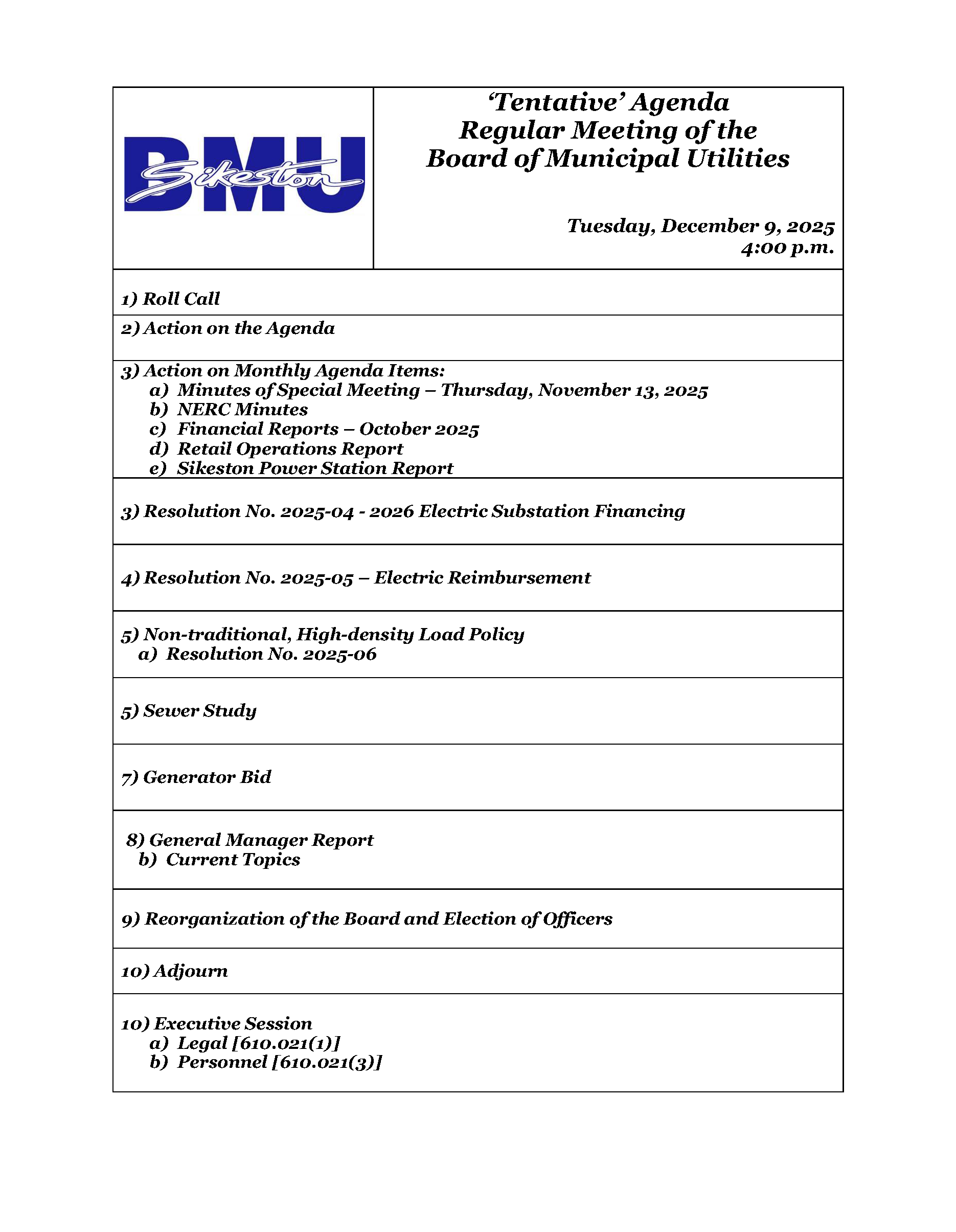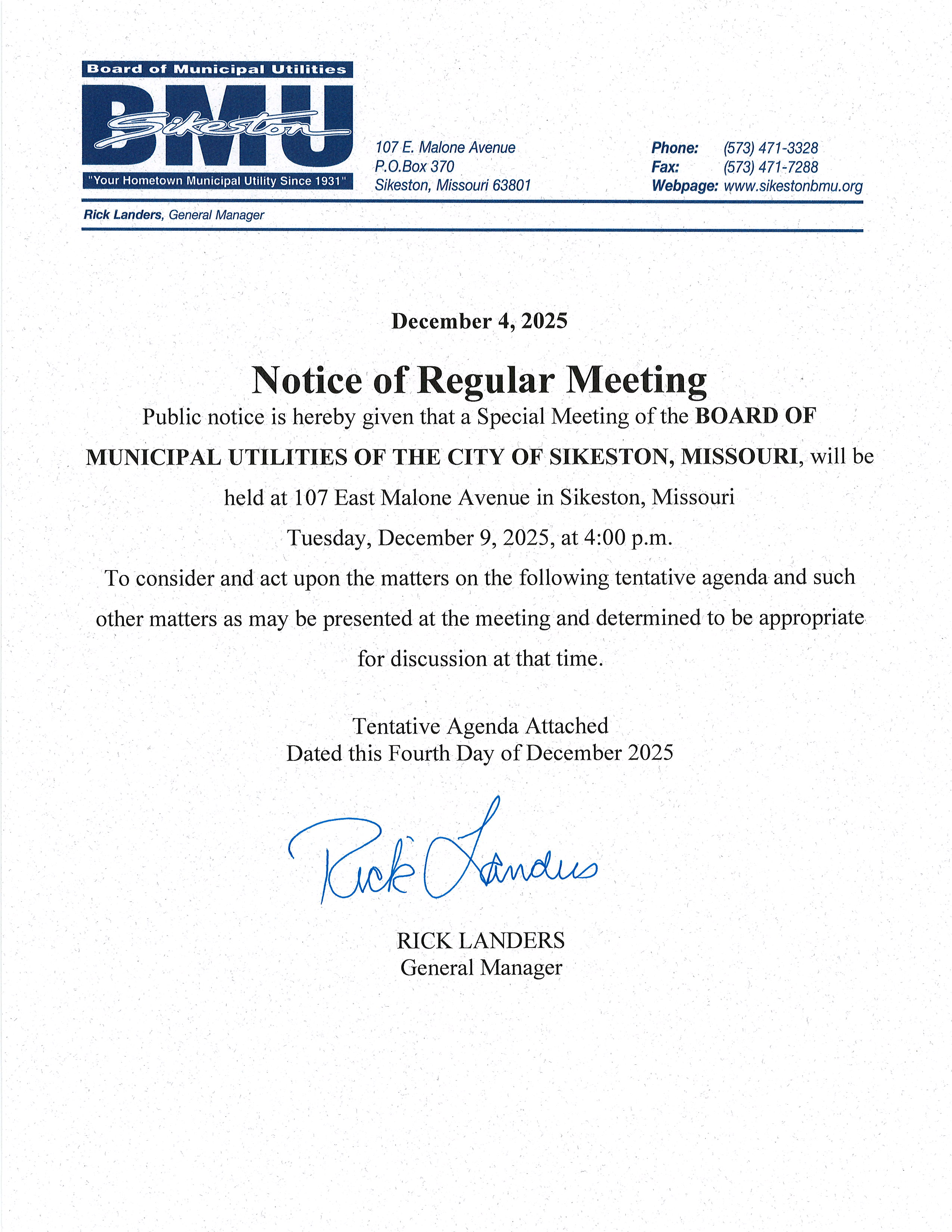 Sikeston Board of Municipal Utilities upcoming meeting notices and tentative agendas will be posted below.